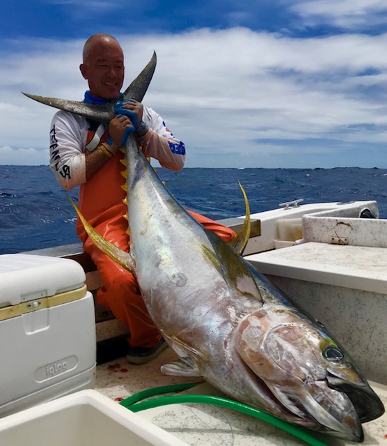 Augustine never drove a boat before grabs the wheel and we get hands on training as we go to work. 20 minutes later we see color and as brent is leadering the fish I accidentally drop my bang stick and watch it sink into the deep blue. Brent thought I was doing the harpoon technique like on Wicked Tuna, but I wasn't. I grab the gaff and gaff it while Brent secures it with a second gaff. We were elated and high fives flew all over the boat. It was Brent's first ahi this year and Augustines biggest fish in her life. We take pictures, ice the fish and reset the lures. As soon as I set no. 4 lure, outrigger pops and reel is screaming again! Whaat! No way! As Brent and I clear lines, I can almost see the gold of the center of the spool. I hold tight to the line hoping not to get spooled. 30 minutes but what seemed like an hour I pull while Brent cranks and Augustine drives. We finally see color and somehow get a gaff and meat hook into the fish. We have the hardest time getting it over the rail so I look for another meat hook while Brent holds on. The fish gets a second wind and starts to amp on Brent, he almost loses his finger, drops the fish and meat hook and the fish swims down. Oh No! I jump on the reel and start cranking hard! Wait! It's still ON! Yes, we bring back up, I get a gaff and after 10 minutes we somehow get it over the rail.